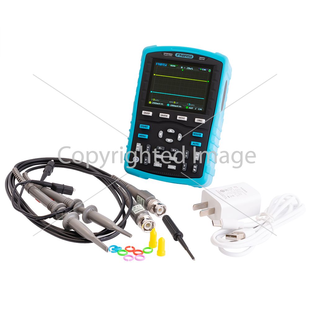 Портативний двоканальний осцилограф. Смуга пропускання: 180 MHz. Частота дискретизації: 500 Msps. Кількість каналів: 2. Вертикальна чутливість: 5 mV-10V. Горизонтальний діапазон: 5nS ... 50s. 3 режими тимчасової розгортки: YT, XY та ковзний. Максимальне навантаження на вході: 80V (x1 зонд), 400V (x10 зонд). Генератор: синусоїда (20Mhz), трикутник, пила, прямокутник та інші (10MHz). Функції: курсор, режим XY, ZOOM, тригер: автоматичний, одиночний, звичайний. Дисплей: 2.8 дюйма IPS 320х240 кольоровий. Живлення: літієва батарея 3000mAh/USB type-C. Габарити: 135x90x40mm